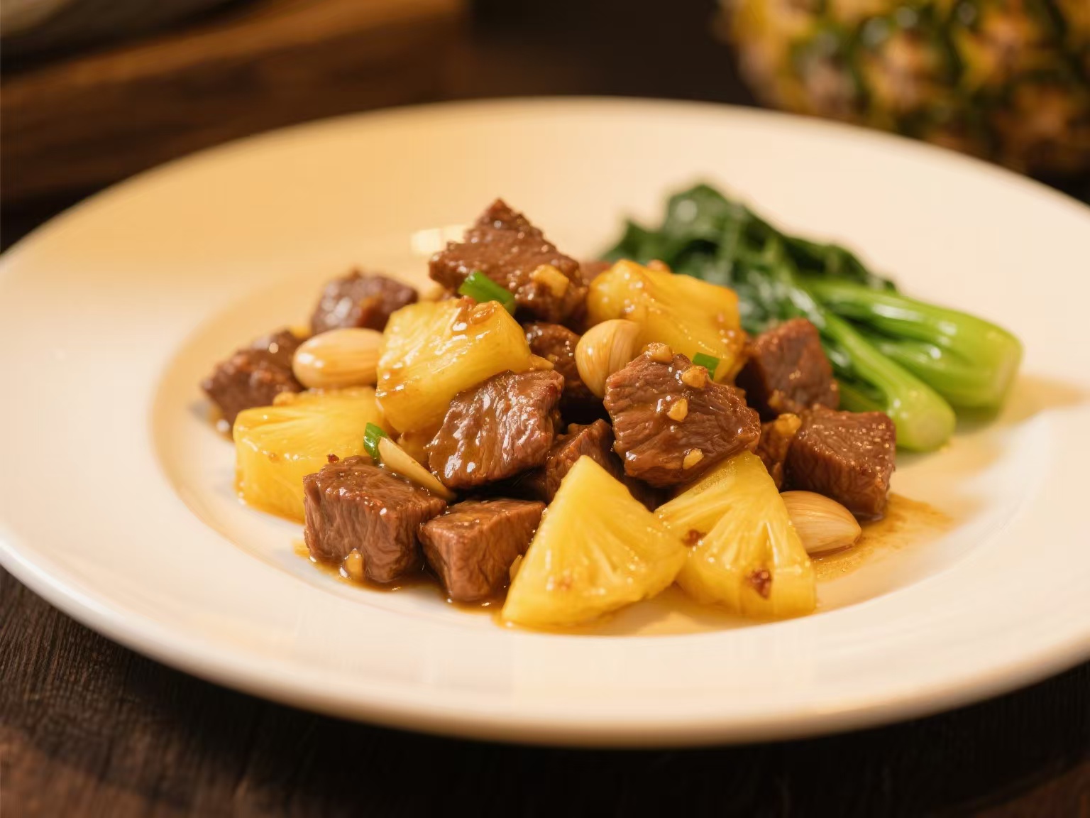 • 加入煎好的牛肉粒、菠萝块翻炒均匀。